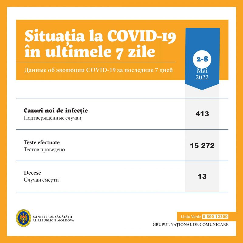 În cursul ultimelor șapte zile, în R. Moldova au fost confirmate pozitiv 413 cazuri noi de infectare cu COVID-19. Laboratoarele din țară au efectuat în această săptămână 15.272 de teste. Astfel, circa 3% din probe s-au dovedit a fi pozitive. În aceeași perioadă, din cauza complicațiilor, 13 pacienți s-au stins din viață, informează Ministerul Sănătății.