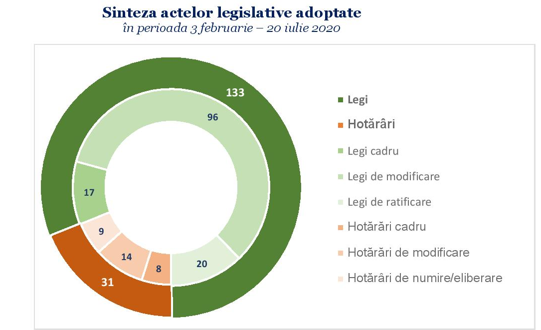 Din totalul de acte adoptate, 133 sunt legi organice, iar 31 sunt hotărâri.