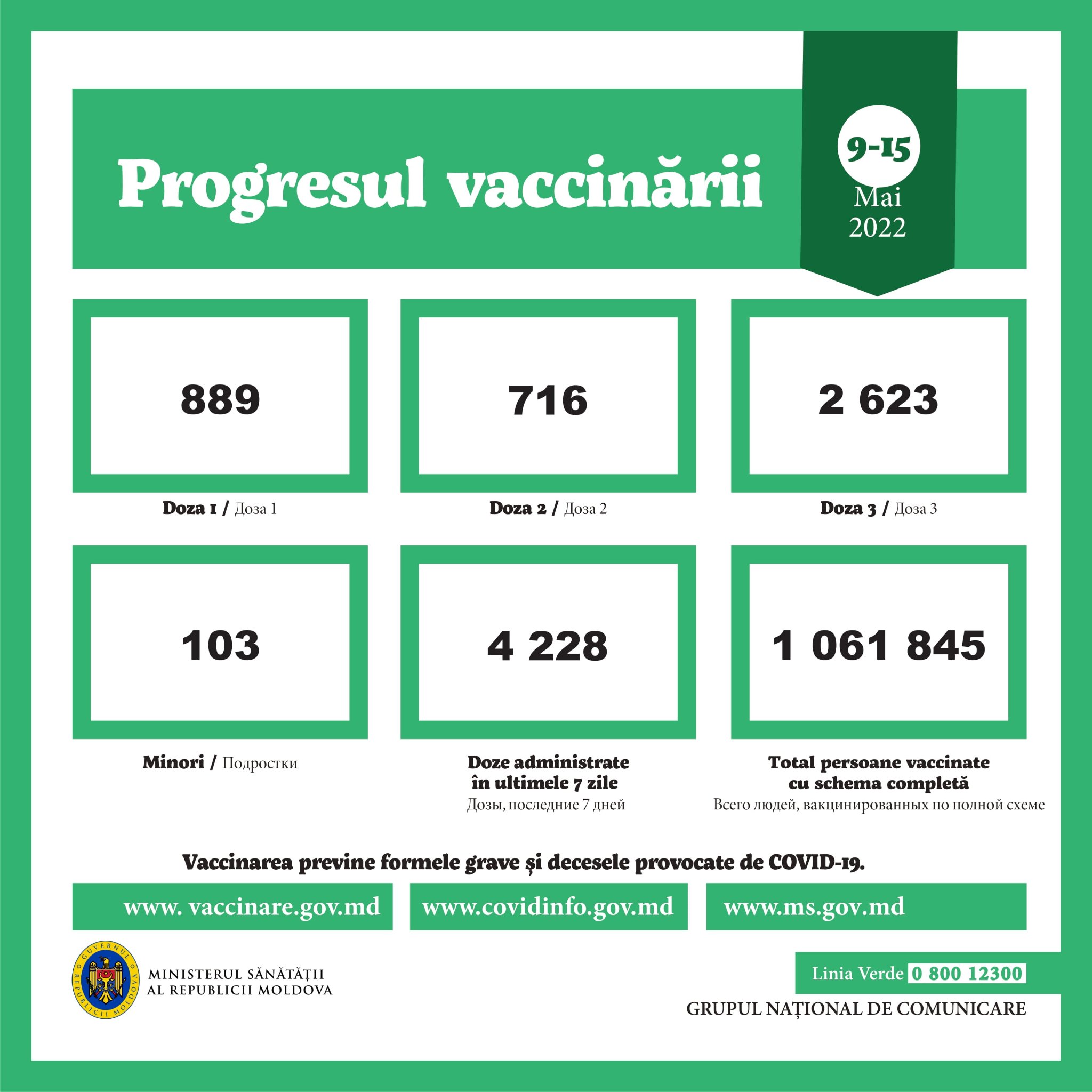 Ministerul Sănătății informează că în perioada 9-15 mai pe teritoriul Republicii Moldova au fost înregistrate 326 de cazuri noi de coronavirus.