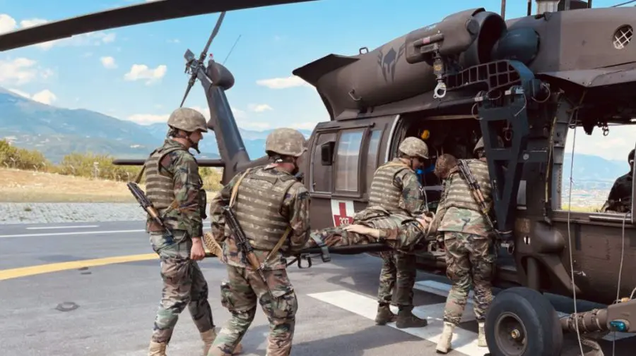 Contingentul Armatei Naționale KFOR-23, trimis în luna iulie 2025, execută exerciții de evacuare cu elicopterul și controlul mulțimii în diverse locații de instruire.