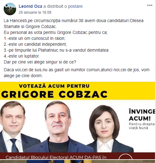 Printre „distribuirile critice” ale aceluiași Josan se numără și postarea lui Leonid Oca, un alt fruntaș al PPDA de la Ialoveni, care menționează că dacă ar fi locuit în Hâncești, ar alege candidatura lui Grigore Cobzac și nicidecum a Olesei Stamate.