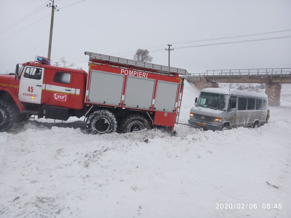 Potrivit datelor înregistrate de IGSU, mai multe autovehicule au fost blocate în zăpadă, sub podul amplasat pe traseul L 703, Vulcănești- Etulia. La fața locului a intervenit un echipaj de pompieri, care ajunși au stabilit, că un microbuz de rută, care transporta 15 pasageri, dar și 7 autoturisme în care se aflau circa 13 persoane, au rămas blocate pe drum.