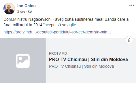 Într-o postare pe facebook, șeful Executivului declară că Ministrul de Justiție poate avea încredere în toată susținerea premierului și că, în opinia lui Chicu: „Banda care a furat miliardul în 2014 începe să se agite…”