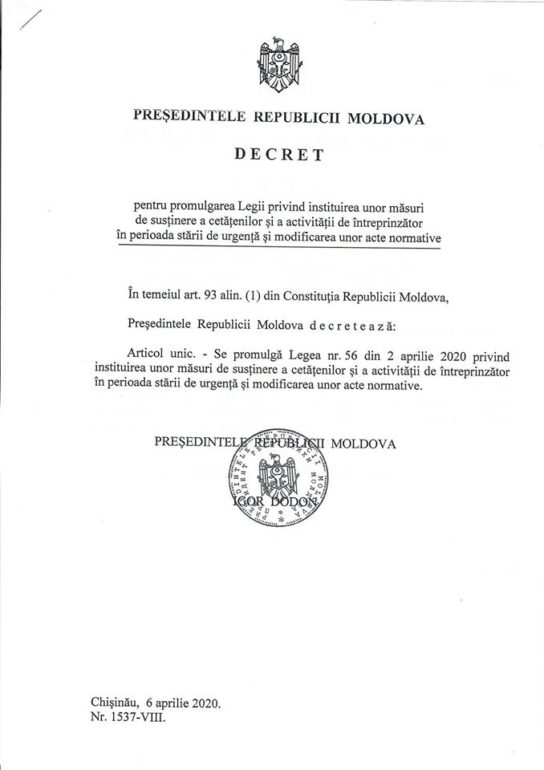 Legea privind instituirea unor măsuri de susținere a cetățenilor și a activității de întreprinzător în perioada stării de urgență și modificarea unor acte normative (nr. 56, 2 aprilie 2020), asumată de Guvernul Chicu, a fost publicată în Monitorul Oficial din 7 aprilie 2020, după ce a fost promulgată de către Președintele Igor Dodon.