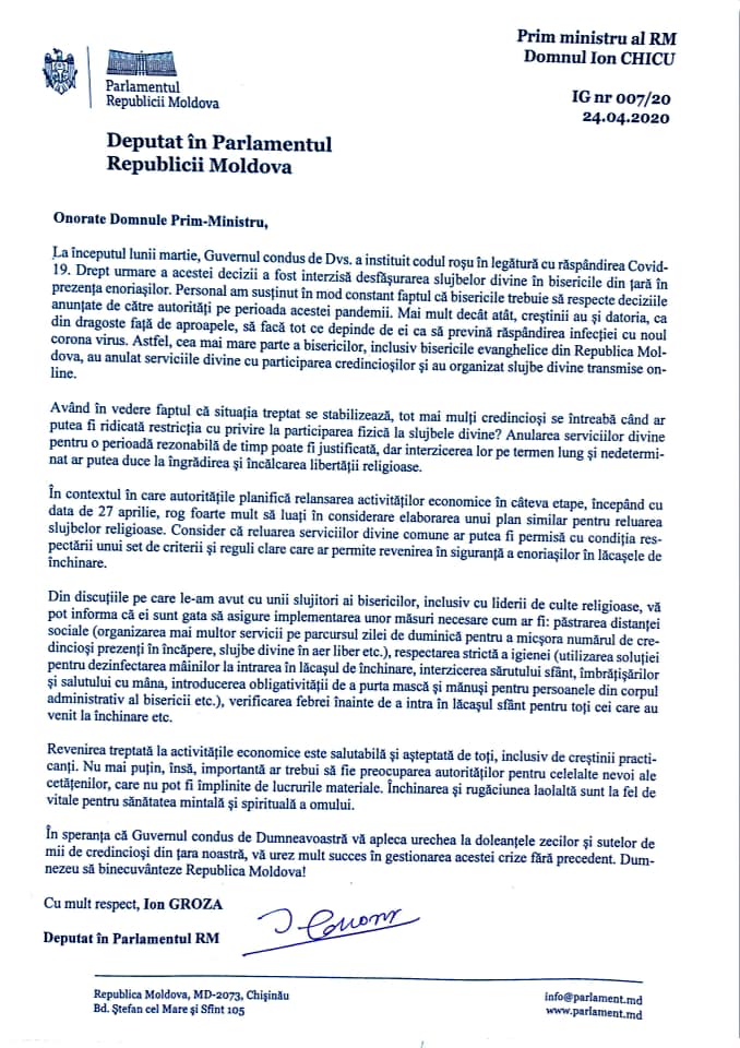 ”Revenirea treptată la activitățile economice este salutabilă și așteptată de toți, inclusiv de creștinii practicanți. Nu mai puțin, însă, importantă ar trebui să fie preocuparea autorităților pentru celelalte nevoi ale cetățenilor, care nu pot fi împlinite de lucrurile materiale. Închinarea și rugăciunea laolaltă sunt la fel de vitale pentru sănătatea mintală și spirituală a omului”, a menționat Groza în adresarea pe care a scris-o împreună cu Valeriu Ghilețchi.