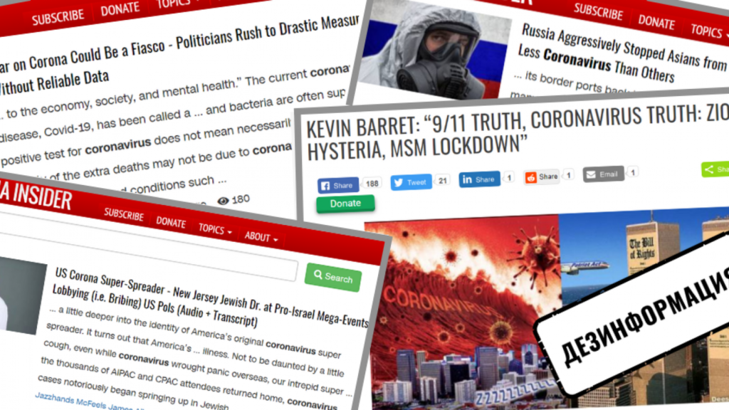 Doar în februarie-martie, în baza de date EUvsDisinfo au fost înregistrate peste 110 exemple de dezinformare despre coronavirus, distribuite de mass-media pro-rusă. Exemplele respective erau în conformitate cu strategia tradițională a Kremlinului de semănare a neîncrederii și a haosului și de exacerbare a situațiilor de criză și problemelor care provoacă neliniști publice. Mai mult, dezinformarea pentru audiența rusă a descris virusul drept o formă de agresiune străină, susținând că coronavirusul provine din laboratoare secrete americane sau occidentale. Dezinformarea pentru audiența internațională s-a concentrat pe teoriile conspirației despre ”elitele globale” care folosesc în mod intenționat virusul ca armă pentru a-și atinge propriile scopuri.