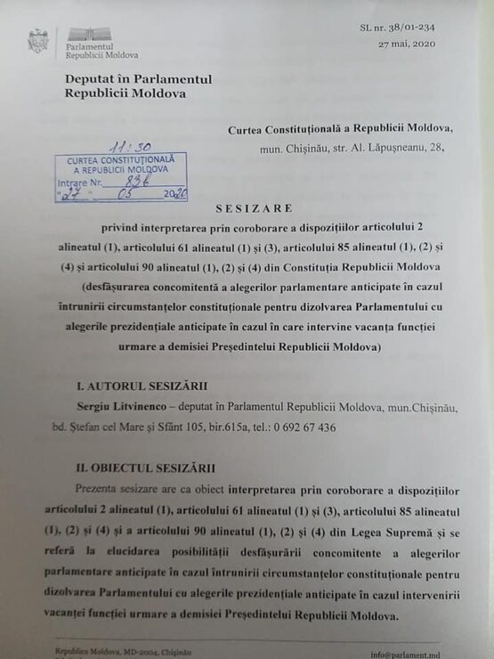 Deputatul fracțiunii parlamentare PAS, Sergiu Litvinenco, a depus miercuri, 27 mai, o sesizare la Curtea Constituțională care se referă la posibilitatea desfășurării concomitente a alegerilor parlamentare anticipate cu alegerile prezidențiale anticipate în cazul în care șeful statului, Igor Dodon, își va depune mandatul de președinte al R. Moldova.