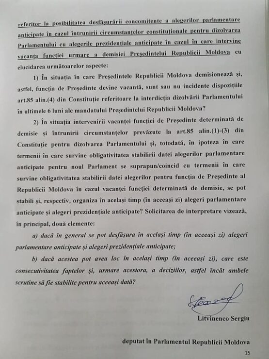 „Am depus la Curtea Constituțională o sesizare privind interpretarea prin coroborare a dispozițiilor articolului 2 alineatul (1), articolului 61 alineatul (1) și (3), articolului 85 alineatul (1), (2) și (4) și articolului 90 alineatul (1), (2) și (4) din Constituția Republicii Moldova care se referă la posibilitatea desfășurării concomitente a alegerilor parlamentare anticipate în cazul întrunirii circumstanțelor constituționale pentru dizolvarea Parlamentului cu alegerile prezidențiale anticipate în cazul în care intervine vacanța funcției urmare a demisiei Președintelui Republicii Moldova”, anunță deputatul PAS.