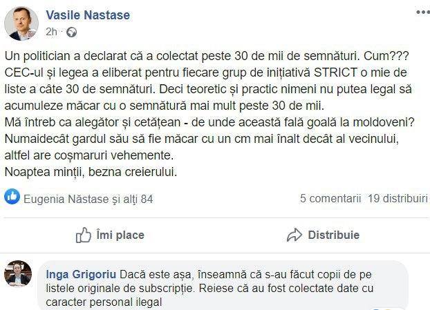 Totodată, deputatul Inga Grigoriu a venit cu detalii despre ilegalitatea comisă de Maia Sandu. Aceasta a scris în comentarii la postarea lui Năstase că “dacă este așa, înseamnă că s-au făcut copii de pe listele originale de subscripție. Reiese că au fost colectate date cu caracter personal ilegal”.