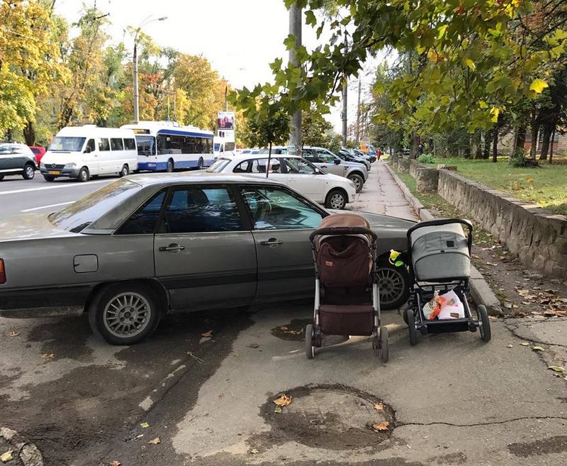 Șoferul unui Audi s-a parcat direct pe trotuar, astfel făcând imposibilă traversarea acestuia, poza e făcută pe strada Kiev din capitală. «Este imposibil de traversat trotuarul pentru un pieton, nu mai vorbim de cărucior» scrie o doamnă pe Facebook.