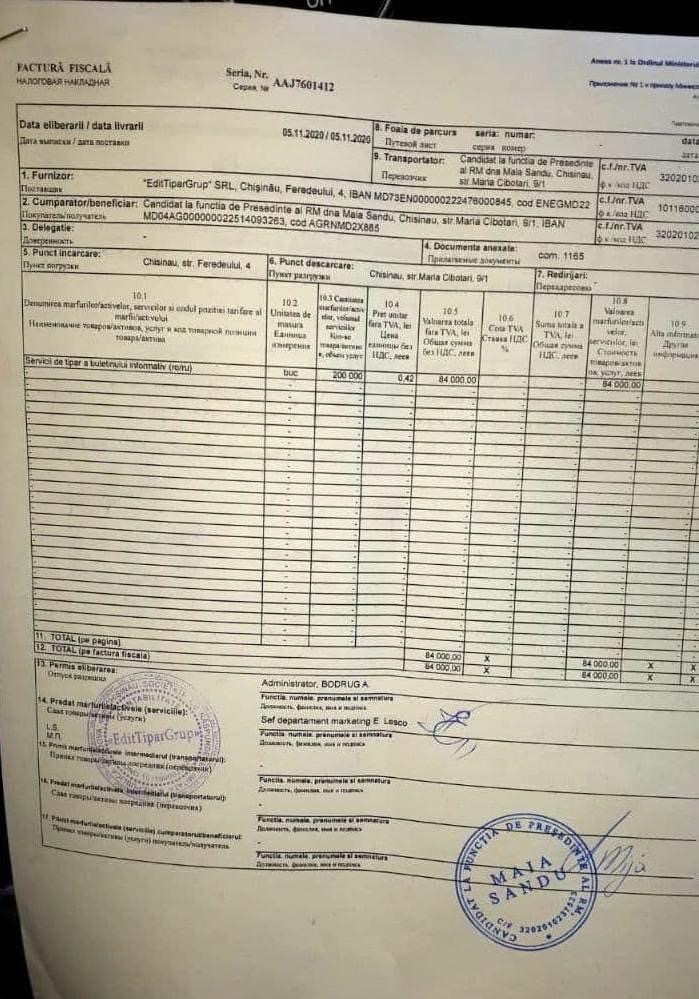 Potrivit facturii fiscale de la aceeași editură “Edit Tipar Group” SRL, ziarele Maiei Sandu sunt tipărite în baza comenzii nr.1165 (factura fiscală din 05.11.20).