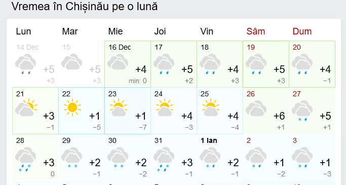 Ne așteaptă un Crăciun fără zăpadă. Cel puțin asta indică datele meteo acum, când ne mai despart două săptămâni de Crăciunul pe stil nou. Tendința se va menține și de Revelion, transmite Telegraph.md, cu referire la Unica.md