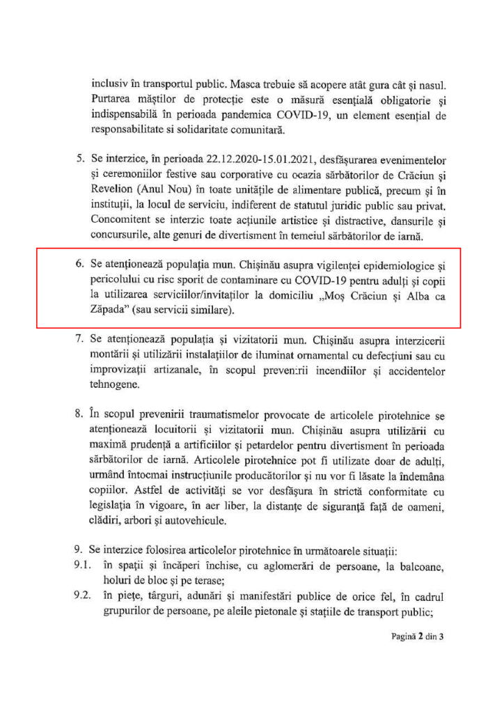Primăria municipiului Chișinău a atenționat cu privire la riscul sporit de infectare cu COVID-19, pentru adulți și copii, la utilizarea serviciilor la domiciliu ce se referă la invitarea pesonajelor Moș Crăciun și Alba ca Zăpada sau servicii similare.