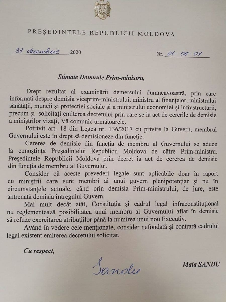 Deputatul socialist Bogdan Țîrdea a publicat o scrisoare emisă de Maia Sandu către premierul Ion Chicu în ziua de 31 decembrie 2020, transmite Telegraph.md, cu referire la Politics.md