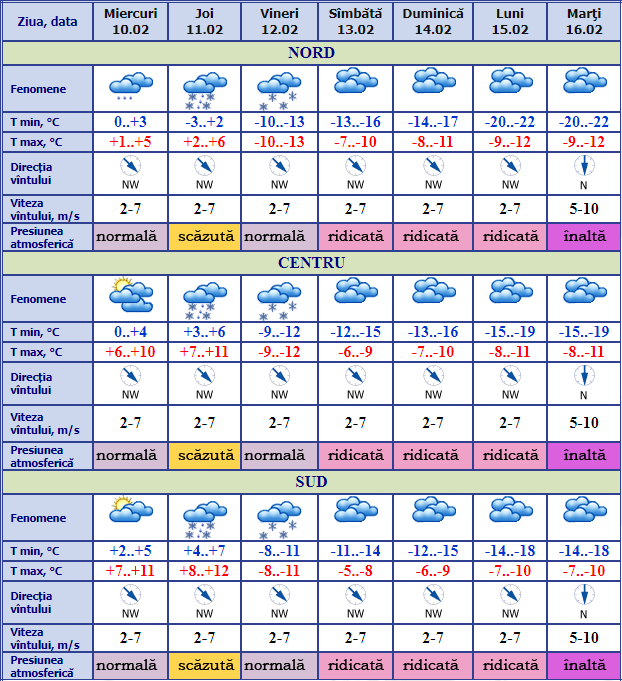 De asemenea, în legătură cu pătrunderea maselor de aer rece de origine arctică, în perioada 12-17 februarie temperatura aerului noaptea treptat va scădea de la -8..-13°C până la -14..-19°C, spre sfârșitul perioadei la nord până la -20..-22°C, iar ziua va scădea până la -8..-13°C.