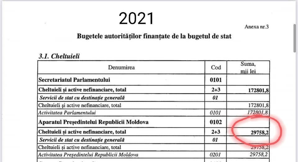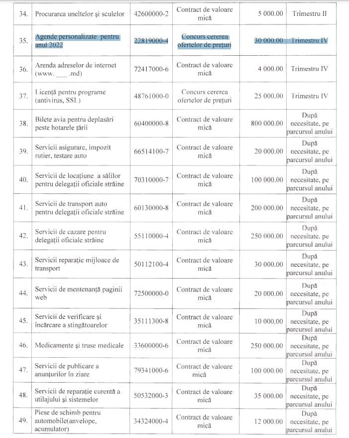 În bugetul pentru 2021, Președinția a prevăzut cheltuieli pentru agende personalizate pentru anul 2022 – 30 de mii de lei s-au alocat în acest scop.