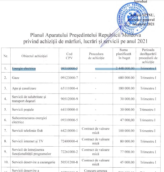 Printre cheltuielile prevăzute de AP condus de Maia Sandu vedem că cei mai mulți bani sunt alocați pentru energia electrică peste 2,4 mln lei doar pentru primul trimestru. De menționat, că pe parcursul întregului an 2020, pentru lumină s-au cheltuit tot peste 2,4 mln lei.