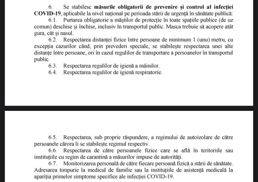 La fel, este obligatorie și respectarea distanței fizice între persoane de minimum 1 metru, cu excepția cazurilor când, prin prevederi speciale, se stabilește respectarea unei ale distanțe între persoane, ori în cazul regulilor de transport a persoanelor în transportul public.