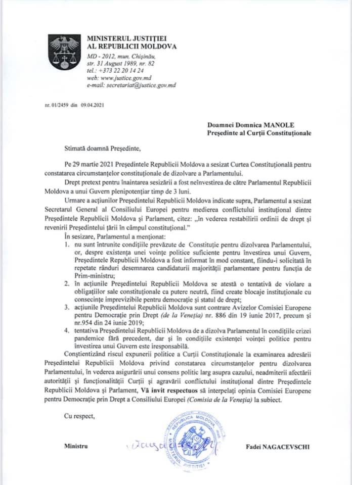 Ministrul interimar al Justiției, Fadei Nagacevschi a semnat o adresare către Cutea Constituțională, transmite Telegraph.md