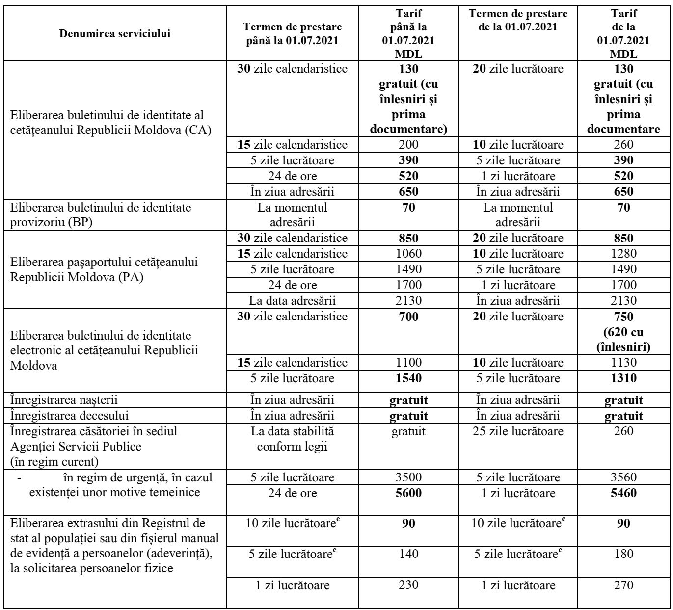 Tarifele la serviciile de înregistrare şi evidenţă a populației nu au suferit modificări pe parcursul anilor precedenți (serviciile de stare civilă –din anul 2008, serviciile de eliberare a actelor de identitate – din anul 2009). Constatăm faptul, că în general, majorarea tarifelor se atestă la serviciile de urgență, fiind micșorat timpul de acordare a acestora, dar un factor important al Nomenclatorului actualizat este menținerea intactă a tarifelor la serviciile de bază cu termenul obișnuit (în pofida faptului că aceste tarife nu reprezintă cheltuielile reale ale Agenției și sunt sub cost), acordând posibilitatea solicitantului de a alege serviciul, de exemplu: