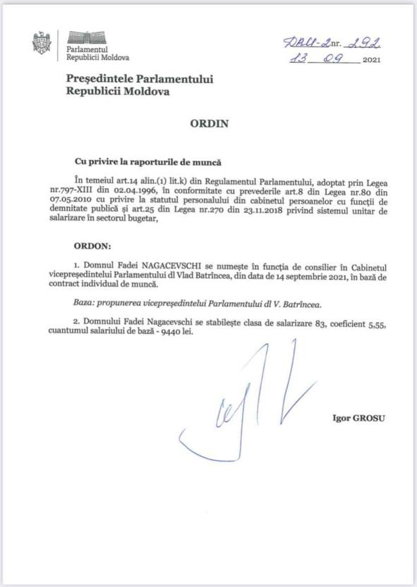 Prin ordinul lui Igor Grosu din 13 septembrie 2021, Fadei Nagacevschi, ex-ministru al Justiției în Guvernul Chicu, a fost angajat la Parlament, informează Telegraph.md