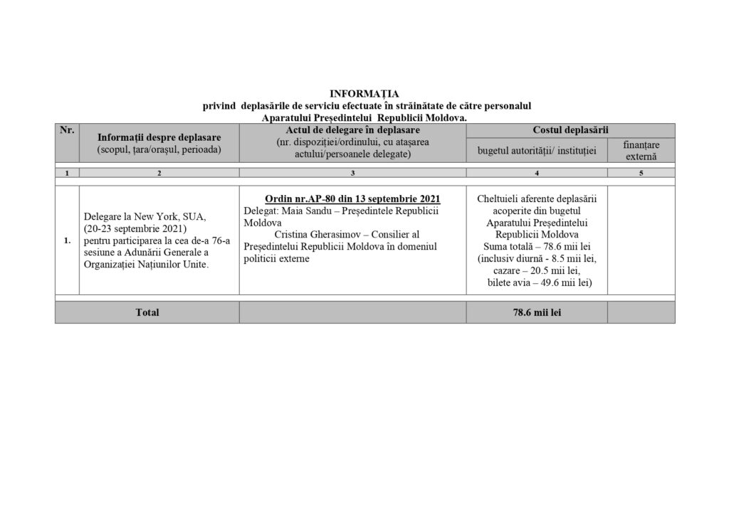 Astfel, potrivit ordinului nr.AP-80 din 13 septembrie 2021, pentru deplasarea președintelui Maia Sandu și a consilierului ei în domeniul politicii externe, Cristina Gherasimov, a fost alocată suma de 78,6 mii lei, inclusiv: