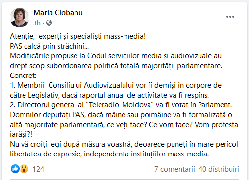 Fostul deputat al Blocului ACUM PAS/DA, Maria Ciobanu, trage un semnal de alarmă. Într-o postare pe rețelele de socializare, Ciobanu a scris că modificările propuse de PAS la Codul audiovizualului vor duce la subordonarea politică a tuturor instituțiilor de media din țară.