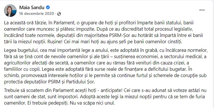 „Adoptă aceste legi la miez de noapte, pentru că se tem de furia oamenilor!”. Astfel președintele țării, Maia Sandu, a comentat în 2020 ședința Parlamentului, la care PSRM și PP ȘOR au votat Legea bugetului de stat și Politica bugetar fiscală. Într-un mesaj pe Facebook, șeful statului critica dur faptul că cele mai importante legi ale anului sunt supuse dezbaterilor la o oră târzie, și că doar hoții și profitorii procedează astfel.