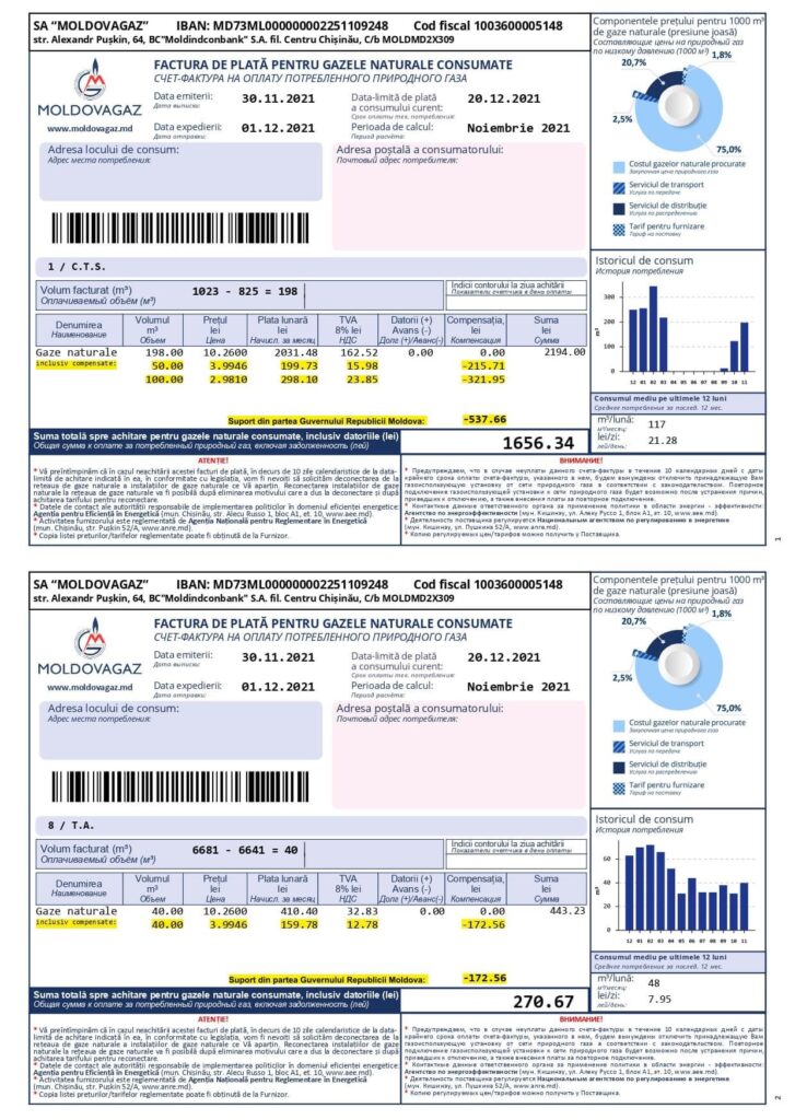 Așa vor arăta facturile la plata gazului natural. Vor fi indicate clar sumele compensate de Guvern.
