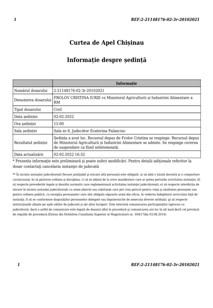 “Recursul depus de Frolov Cristina se respinge; Recursul depus de Ministerul Agriculturii și Industriei Alimentare se admite; Se respinge cererea de suspendare ca fiind neîntemeiată”, au decis astăzi judecătorii Curții de Apel Chișinău.