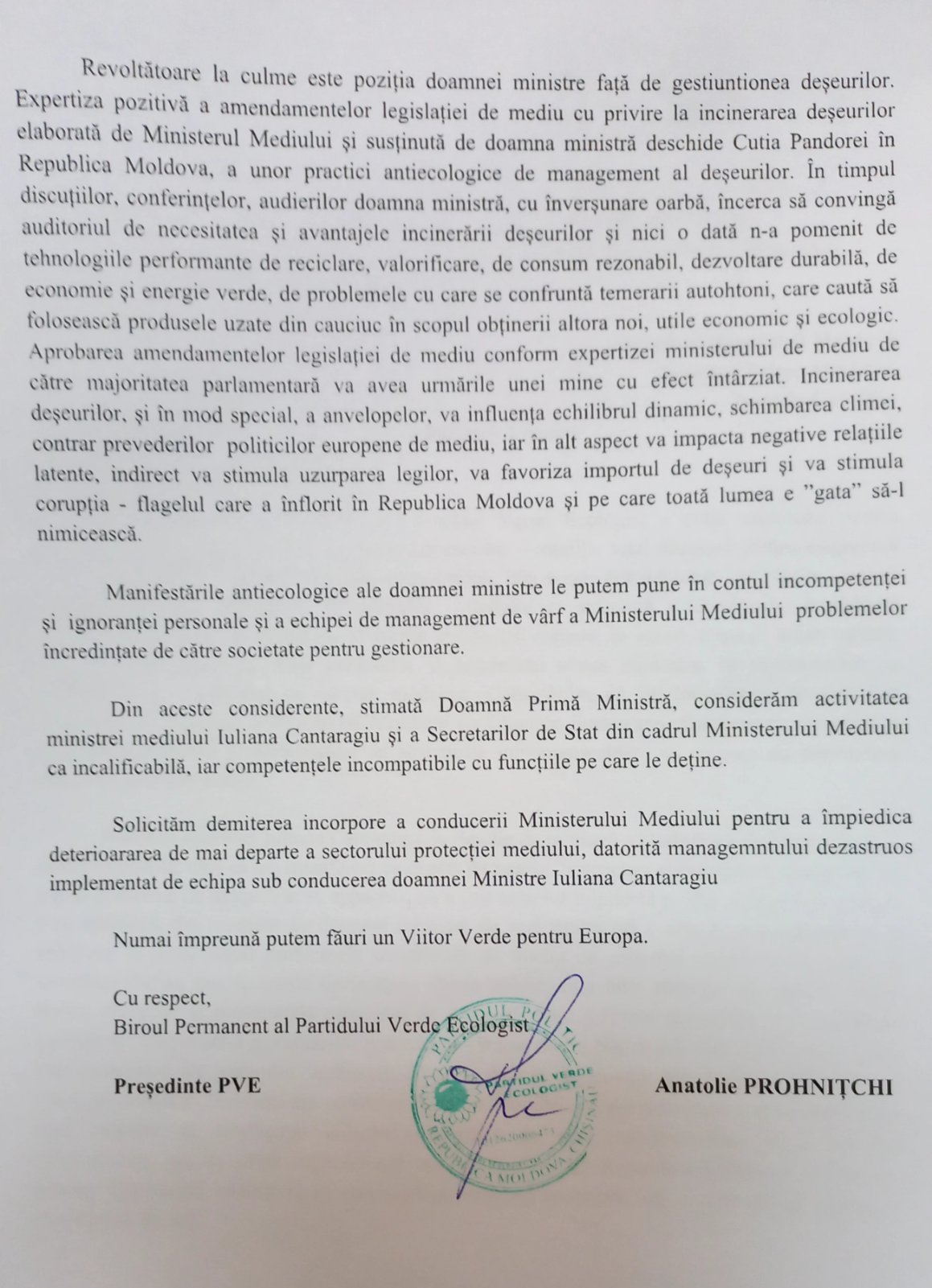 După ce reprezentanții Partidului Verde Ecologist au cerut demisia ministrei Mediului Iuliana Cantaragiu pentru că instituția ar fi avizat și făcut acțiuni împotriva mediului, Ministerul a venit cu o reacție printr-un comunicat în care afirmă că Ministerul are misiunea de a reglementa și domeniul de gestionare a deșeurilor solide.