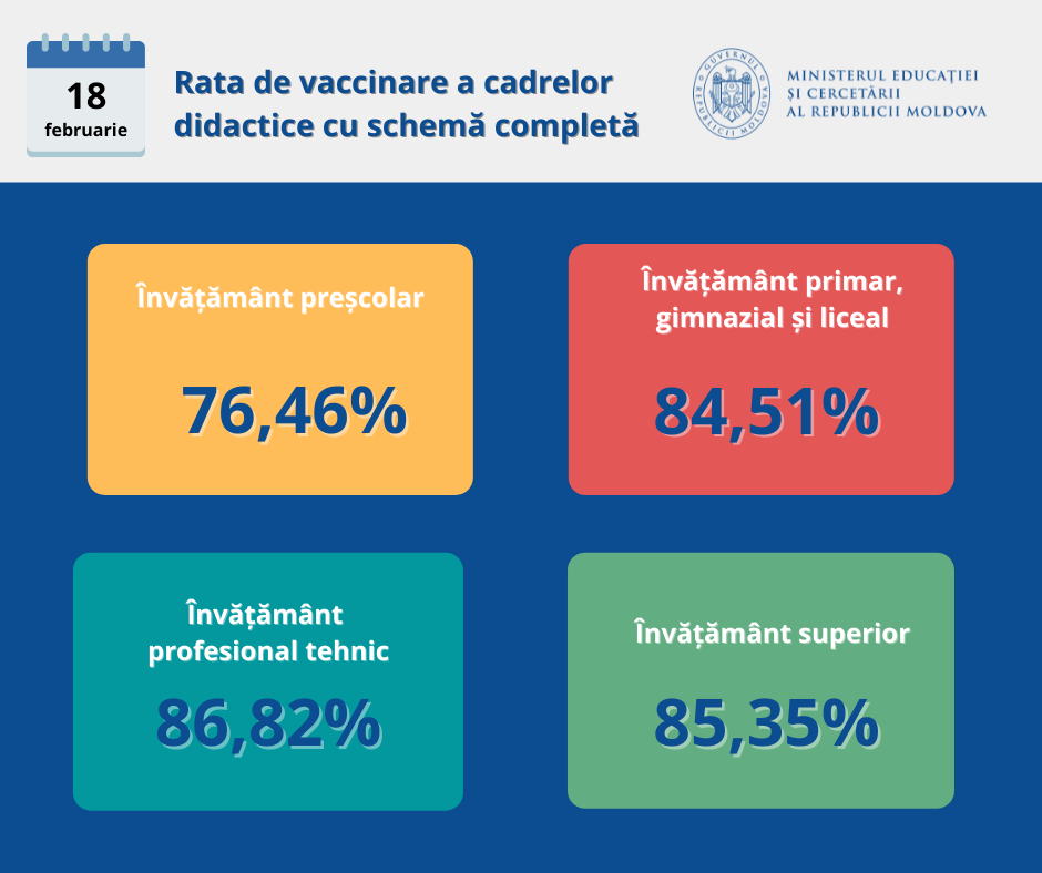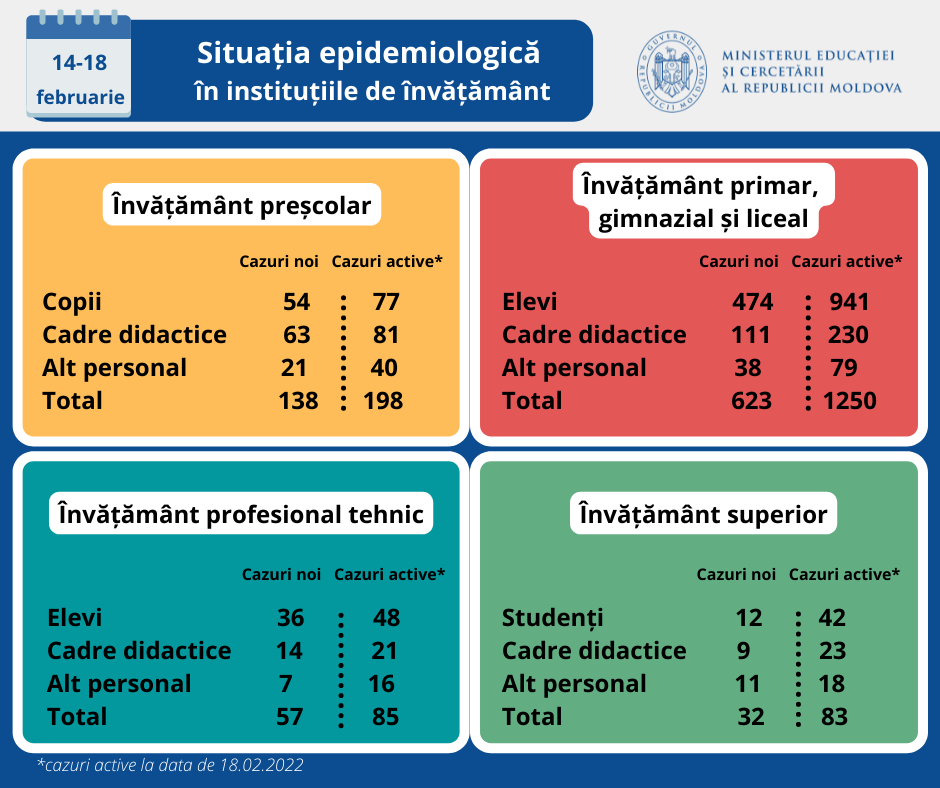 Potrivit datelor puse la dispoziția Ministerului Educației și Cercetării de către organele locale de specialitate în domeniul învățământului și instituțiile de învățământ profesional tehnic și superior, în învățământul preșcolar, primar, gimnazial și liceal, dar și în cel tehnic și superior s-au înregistrat 1 616 de cazuri noi de COVID-19.