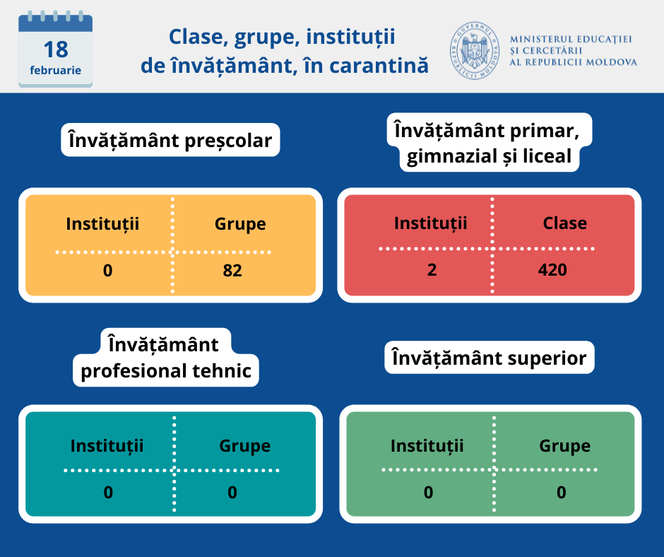 Mai mult, conform informațiilor, din învățământul preșcolar 82 de grupe sunt în carantină, iar din învățământul primar, gimnazial și liceal, sunt în carantină 420 de clase.