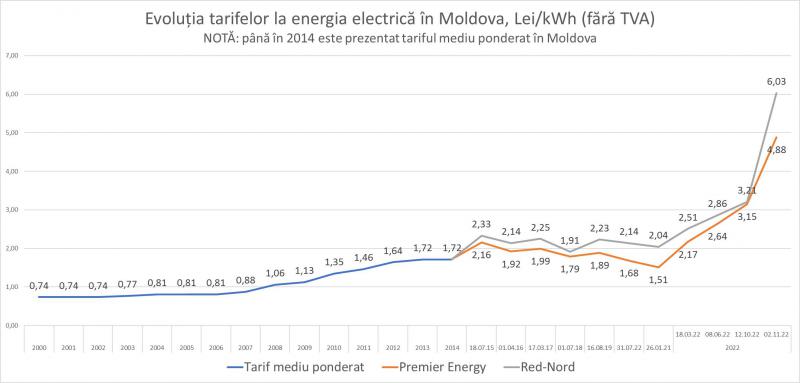 Timp de 22 de ani, tarifele în Moldova au cunoscut o majorare de doar 2 ori, de la 0,74 lei/kWh în 2000 la 1,51 Lei/kWh în martie 2022.