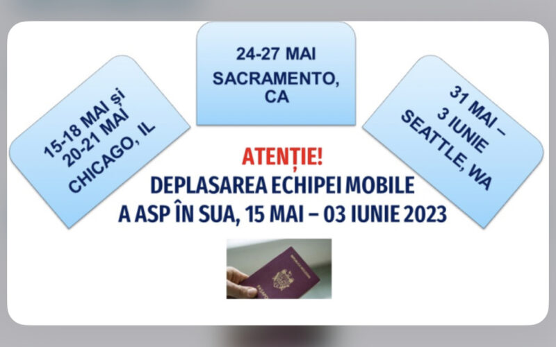 În perioada 15 mai – 3 iunie 2023, Agenția Servicii Publice din Republica Moldova va desfășura o misiune specială în Statele Unite ale Americii, în cadrul proiectului „Ambasada vine mai aproape de tine”. Scopul acestei misiuni este acordarea serviciilor de documentare a populației, în special în ceea ce privește obținerea de acte de identitate și de stare civilă, pentru cetățenii Republicii Moldova care se află pe teritoriul SUA.