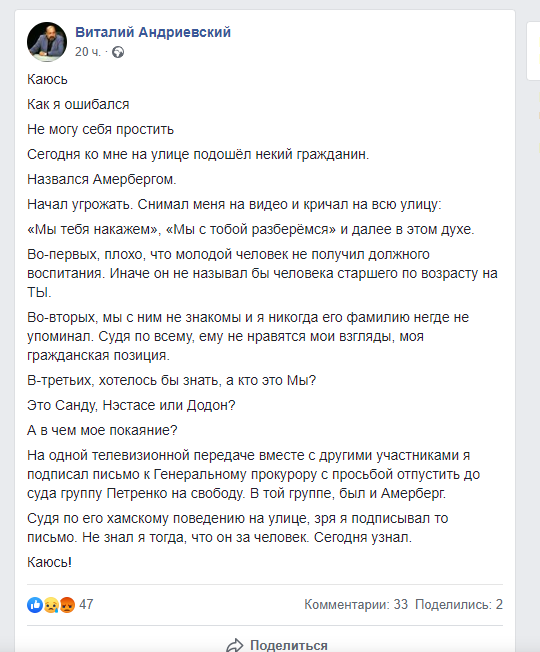 Acesta și-a mai amintit cum în anul 2016, la o emisiune televizată, alături de alți colegi de breaslă, a semnat o scrisoare deschisă către Procurorul General, cu solicitarea de a elibera Grupul Petrenco, în care se afla acest Amerberg. Politologul spune că acum, când a văzut comportamentul acestui individ, îi pare rău că a semnat acea solicitare.