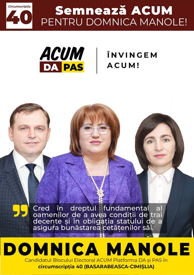 Amintim că Manole a fost candidat din partea bloculuI ACUM la alegerile din 24 februarie 2019 în circumscripția 40 (Basarabească-Cimișlia). Ea a pierdut alegerile în fața candidatului PDM Dumitru Diacov.