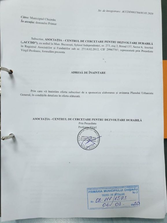 Asociația-Centrul de Cercetare pentru Dezvoltarea Durabilă din București este gata să elaboreze și să actualizeze cu titlu gratuit Planul Urbanistic General al Chișinăului. Valoarea estimativă a donației este de 500 mii de euro.