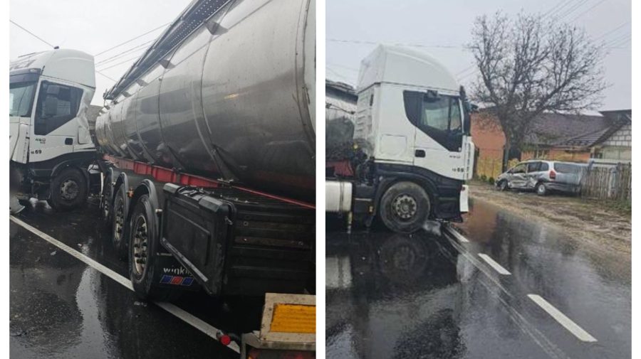 Potrivit poliției, impactul s-a produs între un camion IVECO și un automobil de model Opel care staționa.