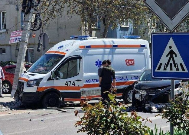 Accident în Cahul: O ambulanță a fost lovită și proiectată într-un pilon electric