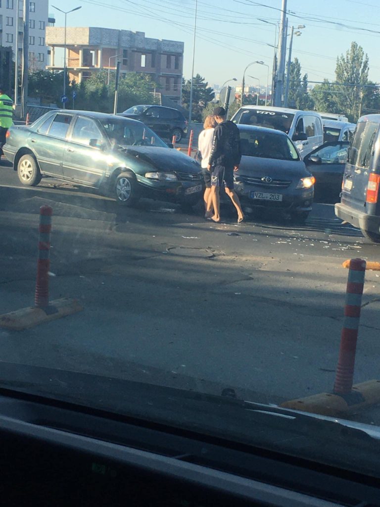 Cu puțin timp în urmă, două mașini s-au ciocnit la sensul giratoriu de lângă Tipografia Centrală, Chișinău.