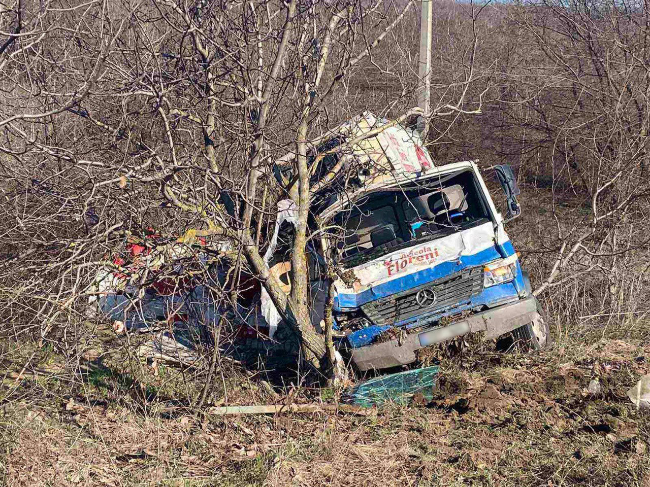 Veniți la fața locului, oamenii legii au stabilit că la volanut microbuzului se afla un bărbat de 44 de ani. Acesta ar fi ieșit pe acostament și ca urmare nu s-a isprăvit cu controlul volanului și a derapat în afara carosabilului.