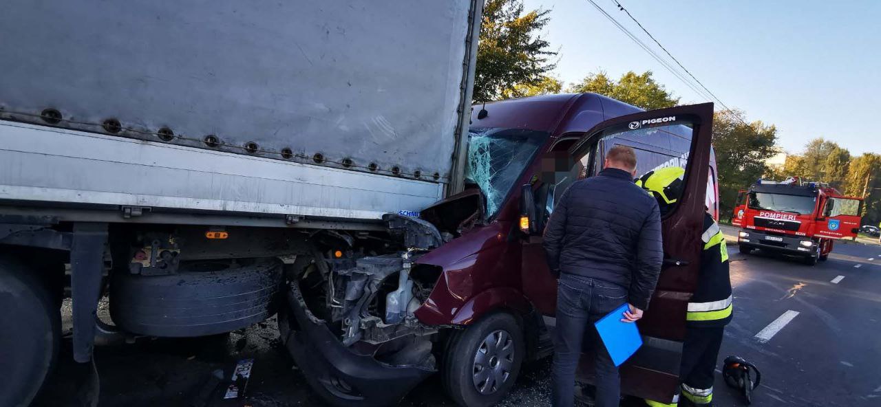 Ajunși la fața locului, angajații IGSU au stabilit că urma accidentului conducătorul microbuzului a rămas blocat între fiarele autoturismului accidentat.