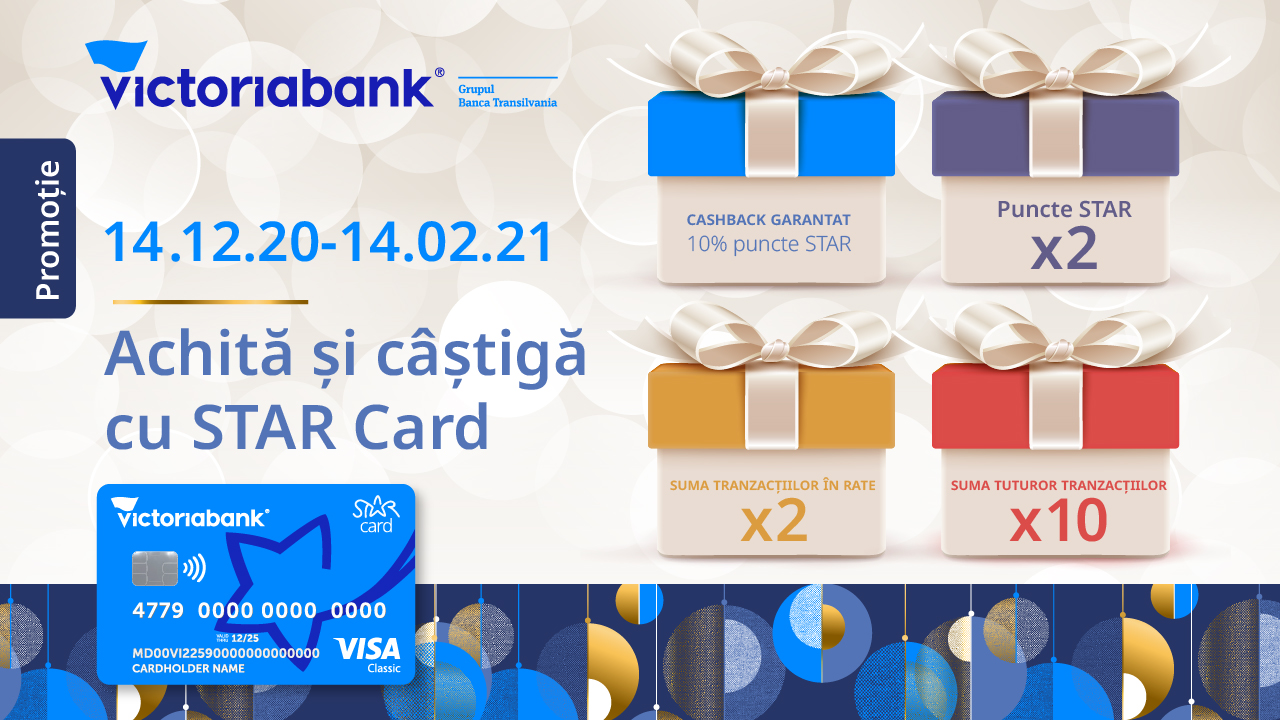 În perioada 14 decembrie 2020 – 14 februarie 2020, banca își bucură clienții, deținătorilor de STAR Card, cu cashback garantat și puncte STAR multiplicate.