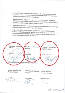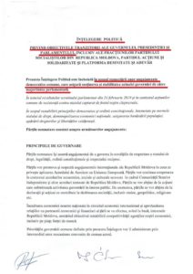 1) Noua „înţelegere politică” dintre blocul ACUM şi PSRM stârneşte mai multe semne de întrebare. Întâi de toate, documentul a fost semnat atât de primele persoane în stat (preşedinte, speaker şi premier), cât şi de exponenţii partidelor care formează majoritatea parlamentară (PSRM, PAS şi PPDA), dar ne este prezentat doar ca unul „inter-instituţional”. Asta în condiţiile în care puterile statului trebuie să colaboreze, dar nu să se subordoneze una alteia. Or, potrivit art. 6 din Constituţie, „în Republica Moldova puterea legislativă, executivă şi judecătorească sînt separate şi colaborează în exercitarea prerogativelor ce le revin, potrivit prevederilor Constituţiei.” De aceea, considerăm că însuşi scopul acestui acord, şi anume ce al „respectării unor angajamente democratice comune, care ASIGURĂ SUSŢINEREA ŞI STABILITATEA ACTUALEI GUVERNĂRI DE CĂTRE MAJORITATEA PARLAMENTARĂ” încalcă flagrant prevederile constituţionale, pentru că Parlamentul nu trebuie să susţină un Guvern, ci „să exercite controlul parlamentar asupra puterii executive” (conform art. 66, lit. f) din Constituţie).