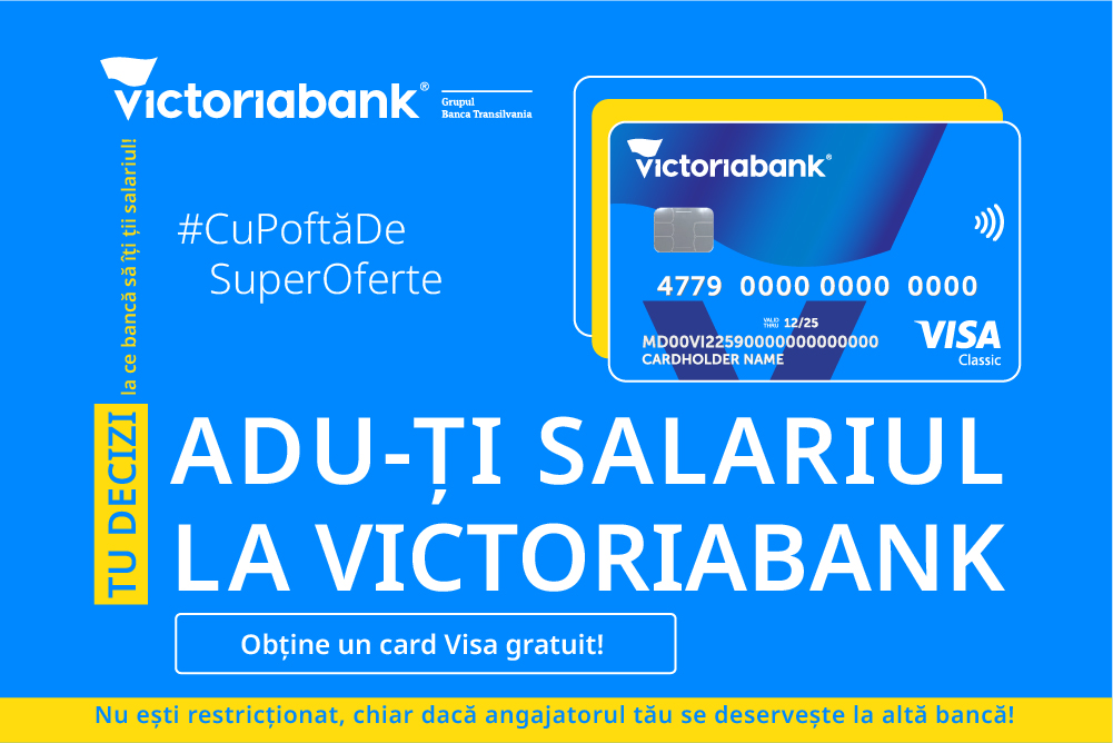 Deschide un card Visa Classic în moneda națională prin proiectul „Adu-ți salariul la Victoriabank”, asigură încasări lunare de minim 4,000 de lei pe acest card și ai totul la pachet:
