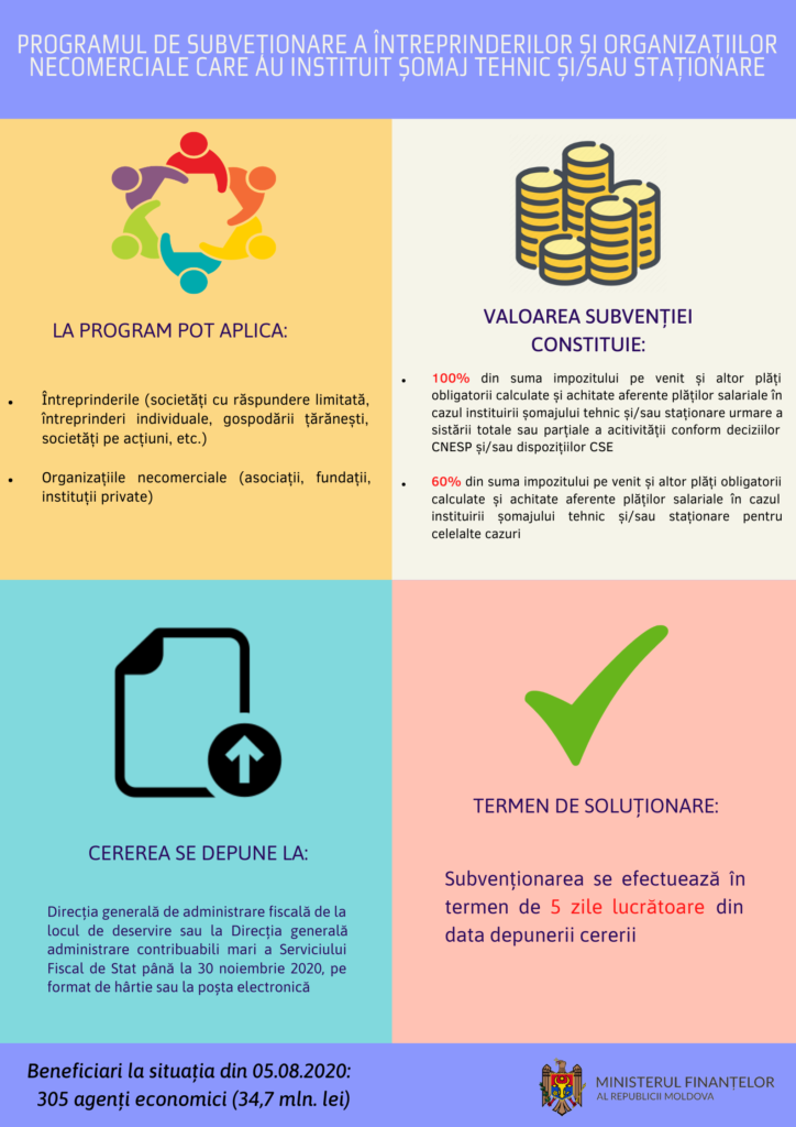 Întreprinderile și organizațiile necomerciale, rezidente ale Republicii Moldova, care au instituit șomaj tehnic și/sau staționare urmare a situației epidemiologice (COVID-19) au dreptul să solicite subvenții de la bugetul de stat. Subvenția se acordă pentru indemnizațiile/salariile aferente șomajului tehnic şi/sau staționării în perioada 17 martie – 31 august 2020.