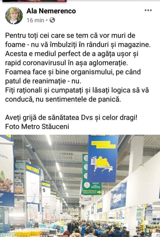 „Pentru toți cei care se tem că vor muri de foame – nu vă îmbulziți în rânduri și magazine. Acesta este mediul perfect de a agăța ușor și rapid coronavirusul în așa aglomaerație. Foamea face și bine organismului, pe când patul de reanimație -nu. Fiți raționali și cumpătați și lăsați logica să vă conducă nu sentimentele de panică.”, scrie Nemereneco într-o postare pe facebook.