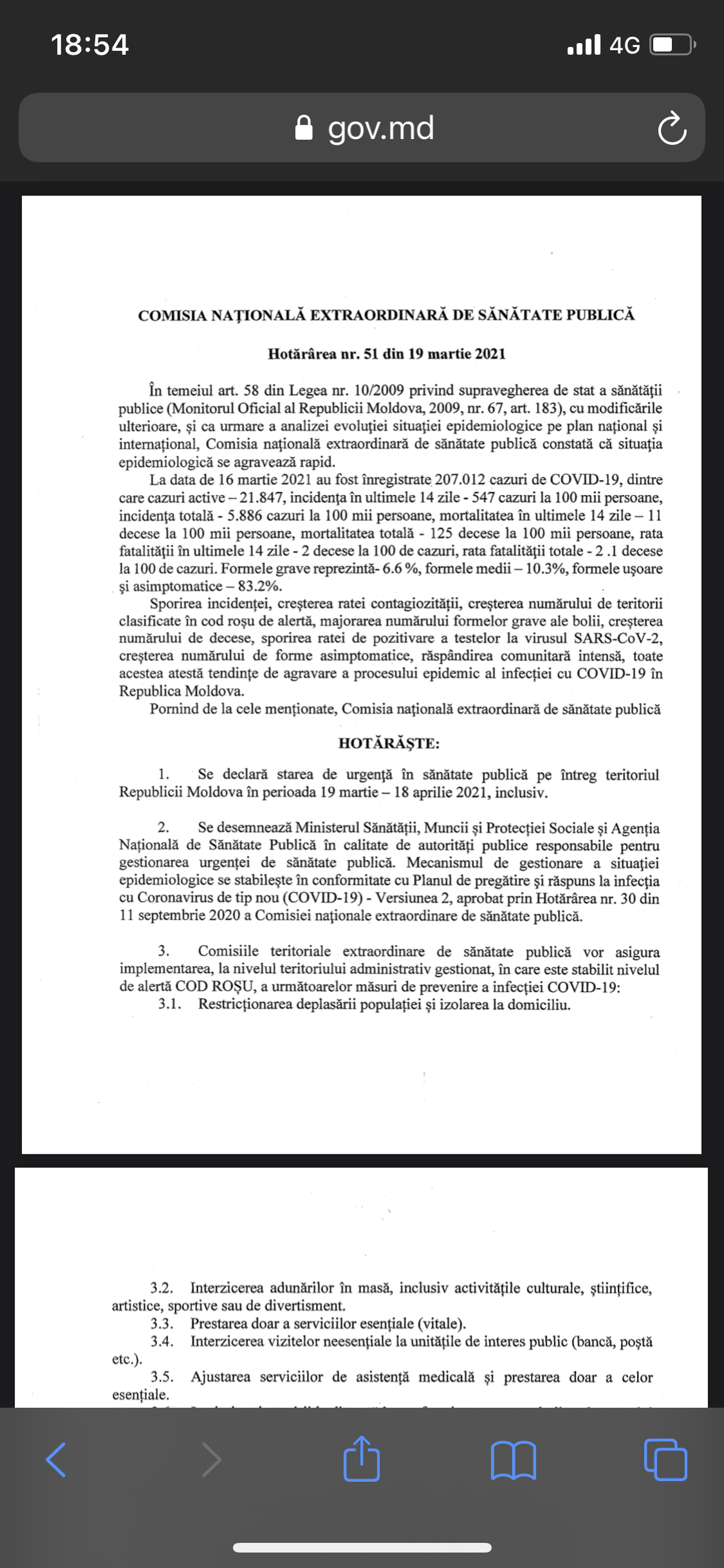 Astfel, urmare a hotărârii CC, de astăzi sunt anulate toate măsurile anti-COVID-19, cum ar fi testul negativ la intrarea în țară, purtarea măștii medicinale, interdicțiile privind funcționarea centrelor comerciale, magazinelor nealimentare și a piețelor, plimbatul prin parcuri și alte locuri publice, termometria la intrarea în spațiile publice și private, alte măsuri dispuse anterior prin hotărârile CNESP, menținute prin hotărârea 51/2021 până la 18 aprilie 2021.