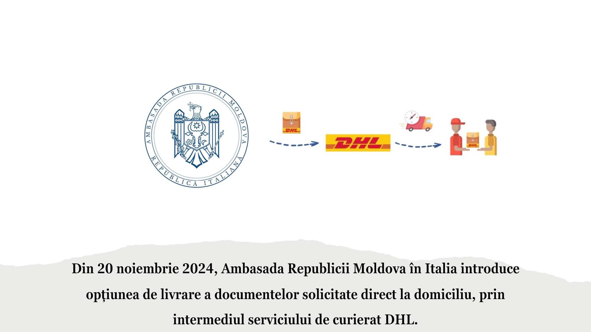 Începând cu data de 20 noiembrie 2024, cetățenii moldoveni din Italia beneficiază de un nou serviciu oferit de Ambasada Republicii Moldova: livrarea documentelor solicitate direct la domiciliu, prin intermediul curierului DHL.